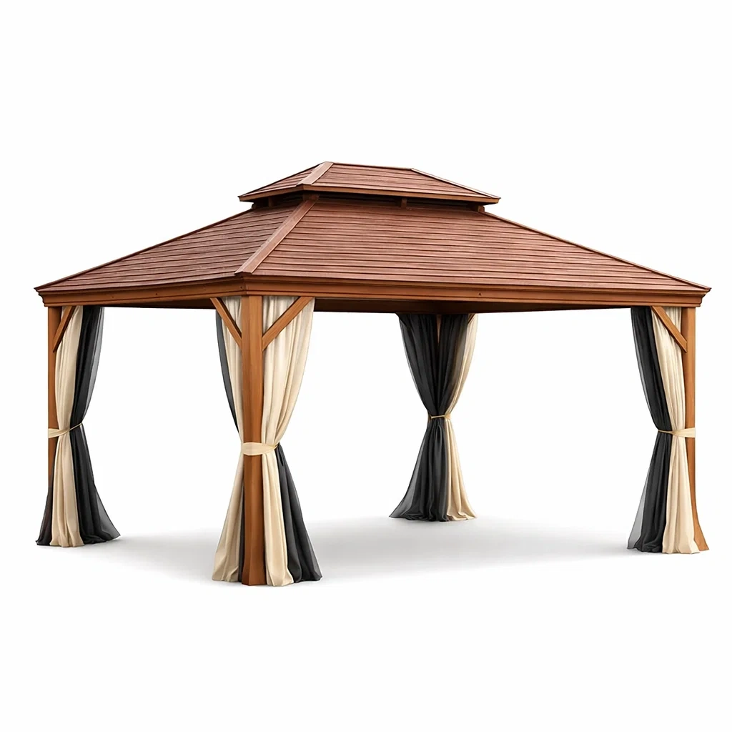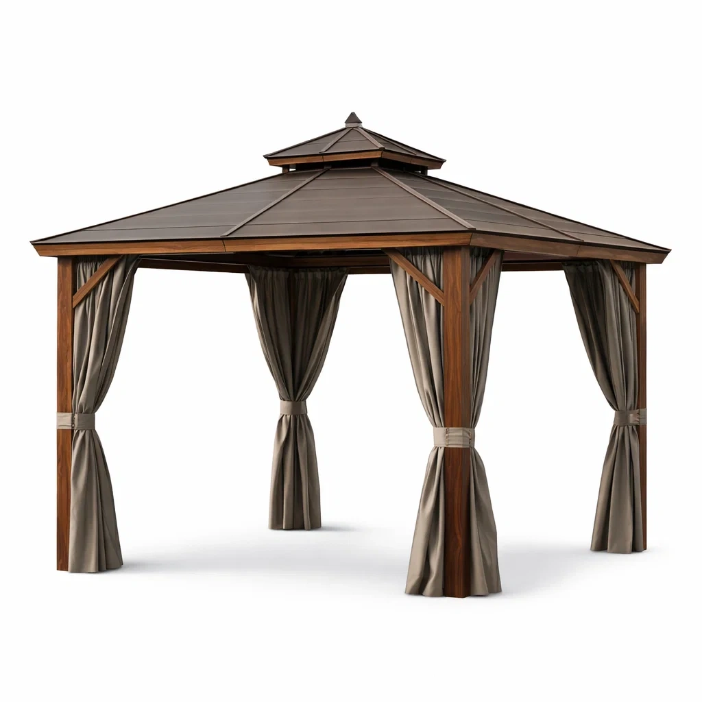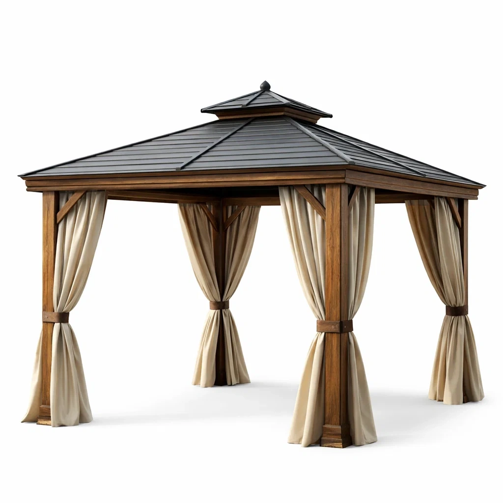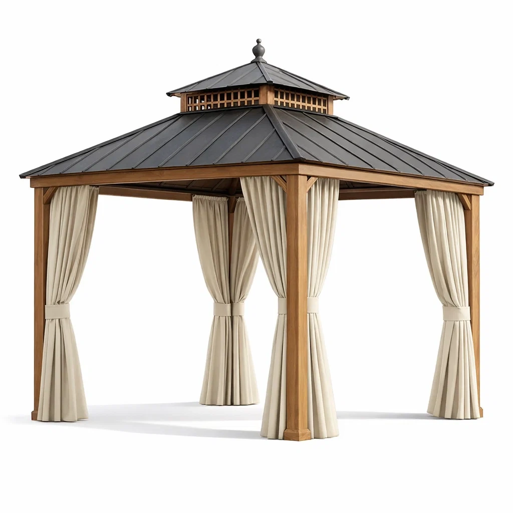 Pavillon en bois avec toit en acier et rideaux en polyester