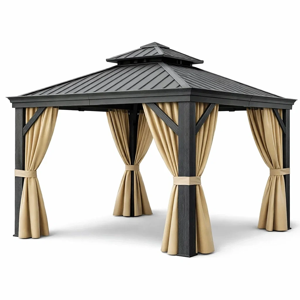 Pavillon extérieur en métal avec toit en acier et rideaux beiges et noirs