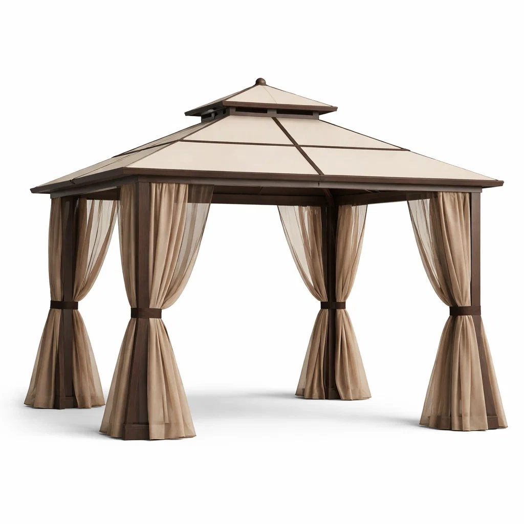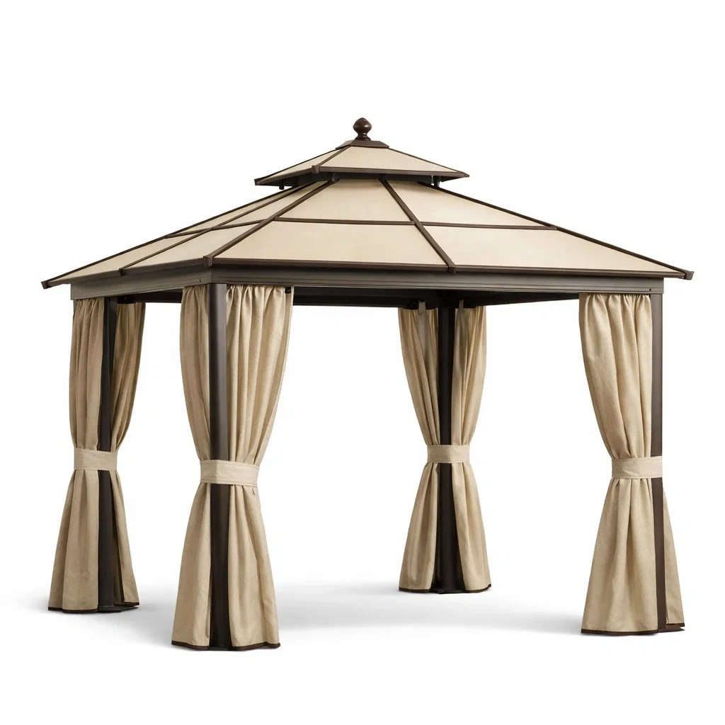 Pavillon extérieur en aluminium et polyester avec rideaux marron et beige