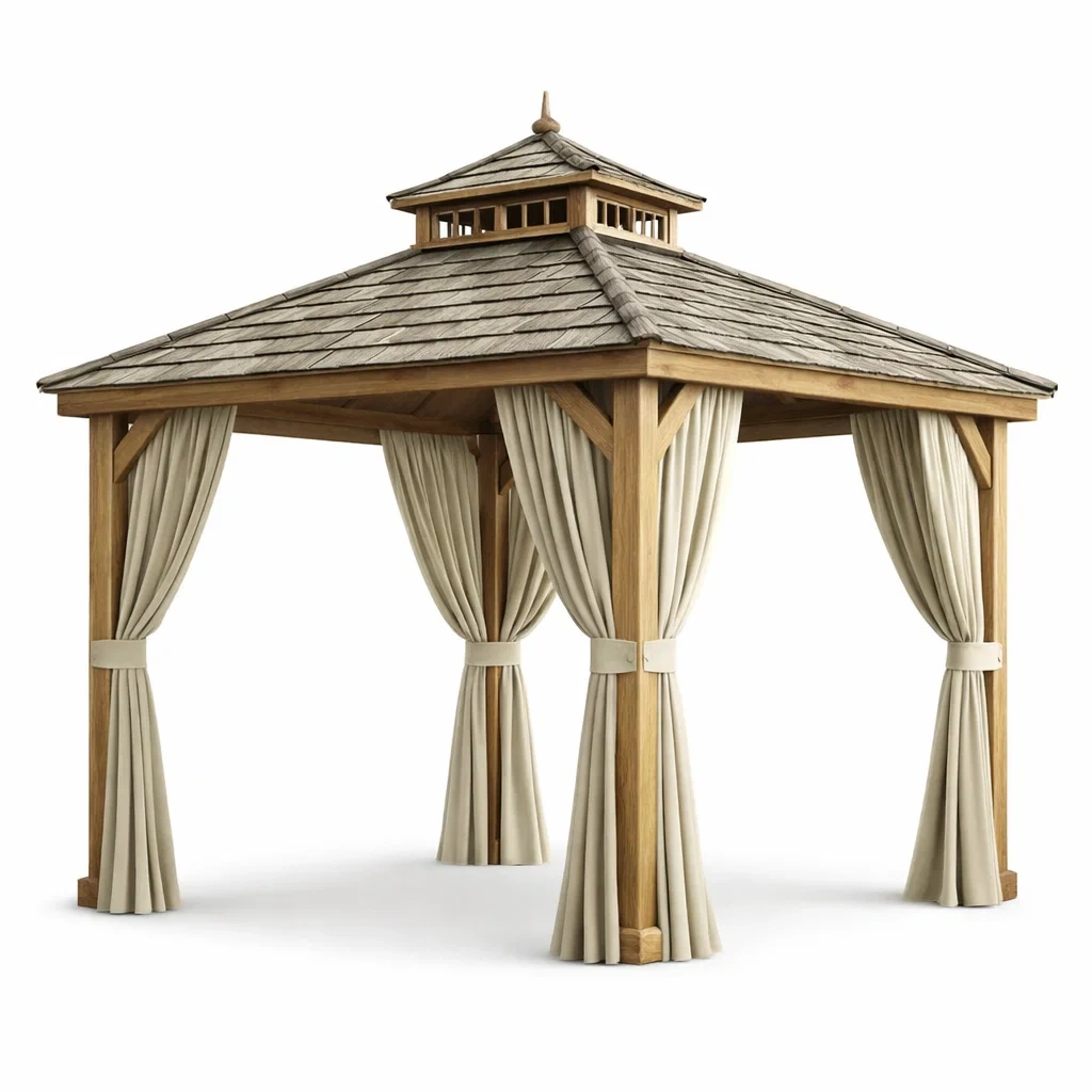 Pavillon en bois et métal avec rideaux beiges