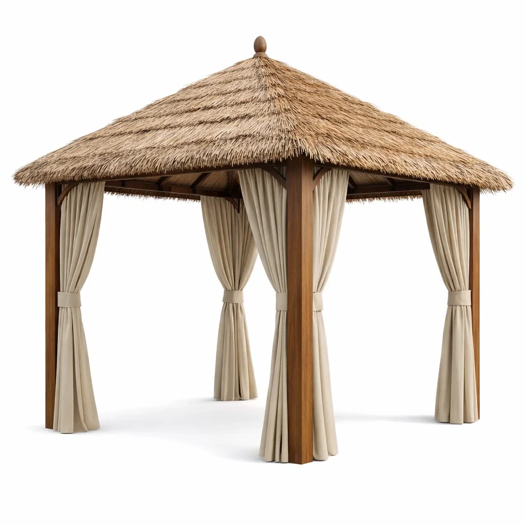 Pavillon en bois avec toit de chaume et rideaux en polyester beige