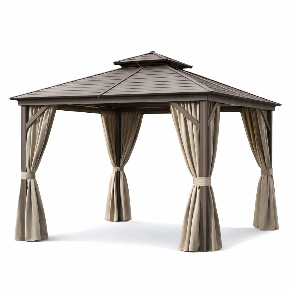 Pavillon en aluminium avec toit en polycarbonate et rideaux en polyester