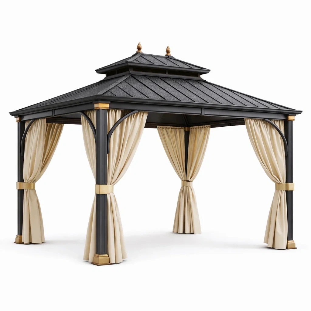 Pavillon en aluminium et acier avec rideaux en polyester beige
