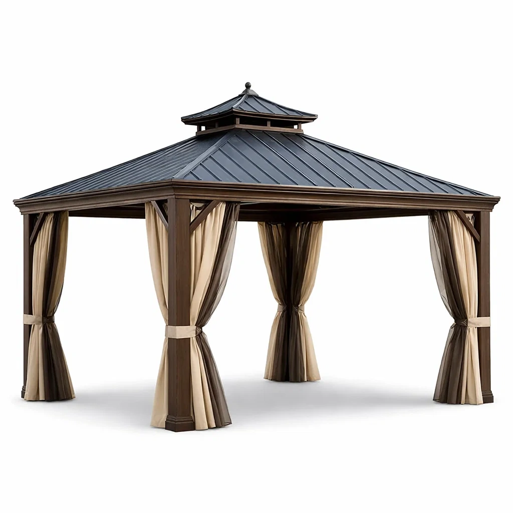 Matériau : Cadre en aluminium, toit en acier galvanisé, rideaux en polyester.