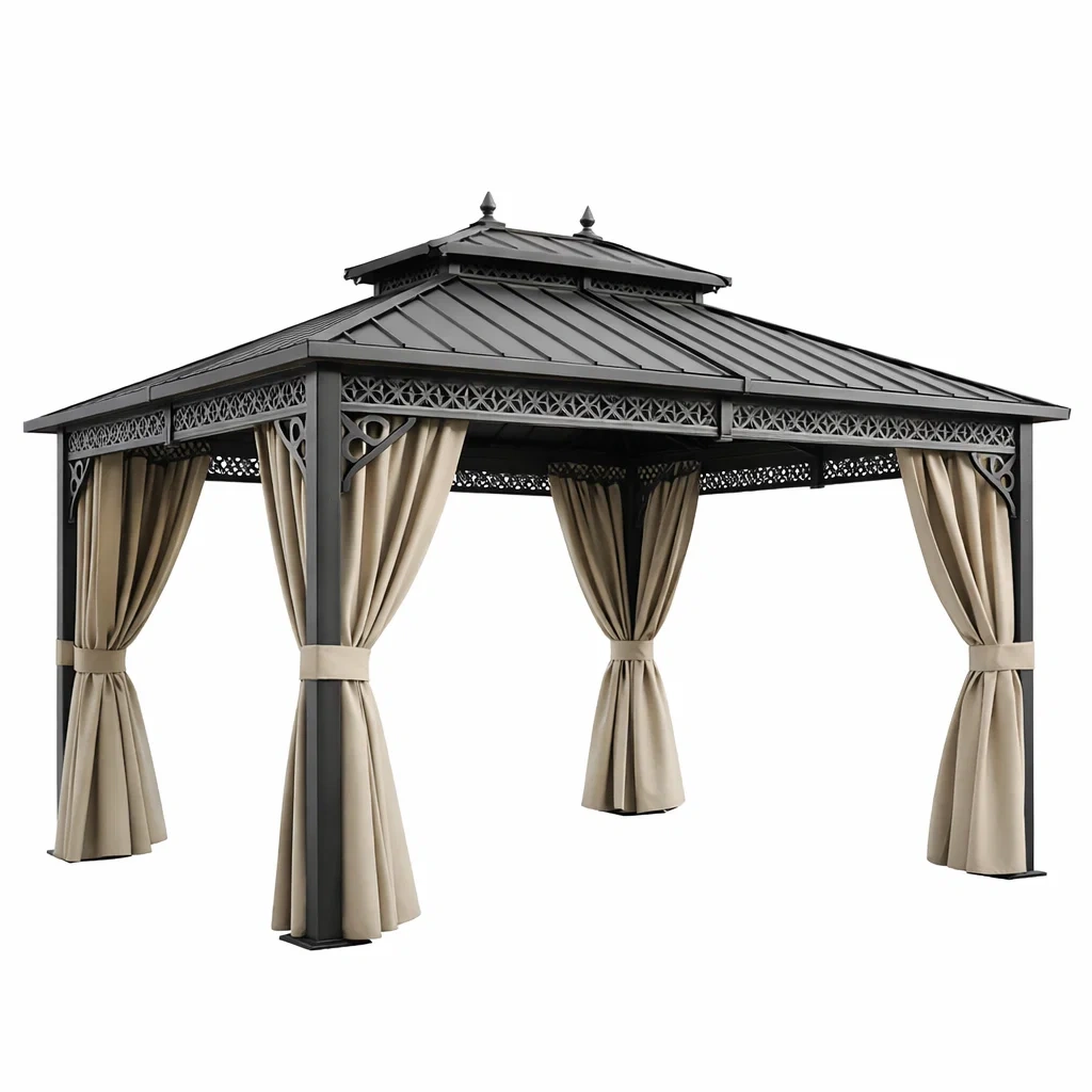 Ce pavillon extérieur est conçu avec un cadre en acier solide et un toit en acier inoxydable, offrant une protection contre les éléments. Les rideaux en polyester beige apportent intimité et fonctionnalité. Le pavillon mesure 3 mètres de long, 3 mètres de large et 2.6 mètres de haut.